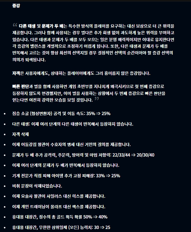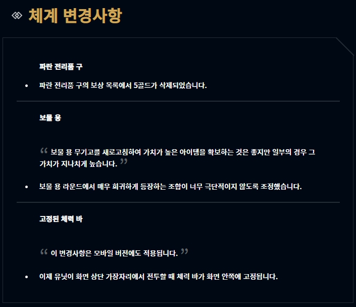 빠른 판단은 이제 마지막 증강체로서만 등장하게 되었고, 자객은 삭제되었으며, 그 외 기물을 하나 지급하는 증강체들이나 아이템을 지급하는 증강체들의 기물, 아이템 종류가 변경되었습니다. 수치 조정도 있구요.
