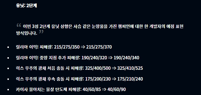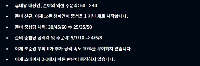 3성 이즈리얼의 스킬 공격력이 버프되었고, 반대로 카르마 3성의 경우 스킬 딜이 너프되었습니다. 그 외에 시오유도 너프되었고 기타 여러 챔피언들이 너프 및 버프되었습니다.
