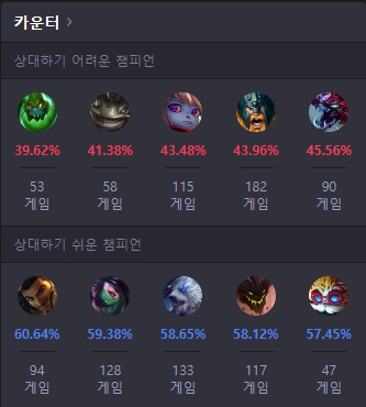 통계로 보면 자크, 탐켄치, 뽀삐, 올라프, 초가스 등이 카운터로 보통 오른이 불리합니다. 반대로 아크샨, 아칼리, 볼리베어, 말파이크, 하이머딩거의 경우 오른이 우세한 승률을 보이고 있습니다.