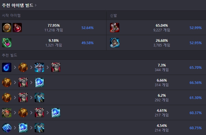 처음 시작 아이템은 도란의 방패, 포션으로 시작하여 중간에 여신의 눈물을 구매해주고 첫 코어 아이템으로는 태양불꽃 방패를 올려줍니다. 태양불꽃 방패를 올린 뒤 신발은 판금 장화를 올려주고, 이후에는 종말의 겨울까지 고정으로 띄워줍니다. 이후에는 평타 기반 챔피언이 강하면 가시 갑옷, AP딜이 강하면 대자연의 힘 등 상황에 맞게 유동적인 템트리를 올려줍니다.