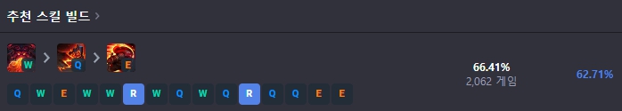 1레벨에는 Q스킬, 2레벨에는 W스킬, 3레벨에는 E스킬을 찍고 4레벨부터는 R-W-Q-E 순서로 스킬을 마스터해주시면 됩니다.