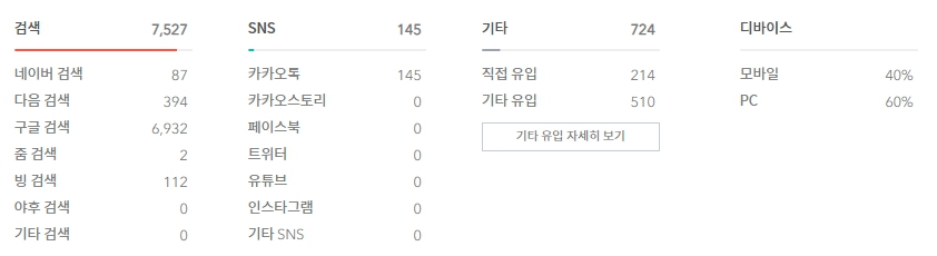 우선 데이터센터에서 화재가 발생하기 전, 카카오 먹통 사태가 발생하기 전의 일일 방문자 수 입니다. 보면 알 수 있다시피 네이버 검색을 통한 방문자 수는 985명, 그리고 기타 유입에서도 네이버를 통해 들어온 사람들이 289명이 있었습니다. 대략 네이버를 통해 블로그에 방문하는 사람들이 1,000명 정도였습니다.