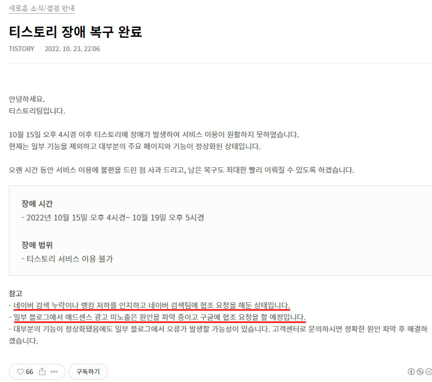 아직까지 완벽히 복구가 된 것은 아니지만, 주요 기능은 정상화 된 상황입니다. 또한 티스토리측도 여러 문제들을 인지하고 네이버 검색팀에 협조를 요청했고, 구글에도 협조 요청 예정이라고 합니다. 과연 해결이 될 지는 모르겠습니다만, 일단 희망을 가지고 상황을 지켜보는 쪽이 좋을 것 같습니다.