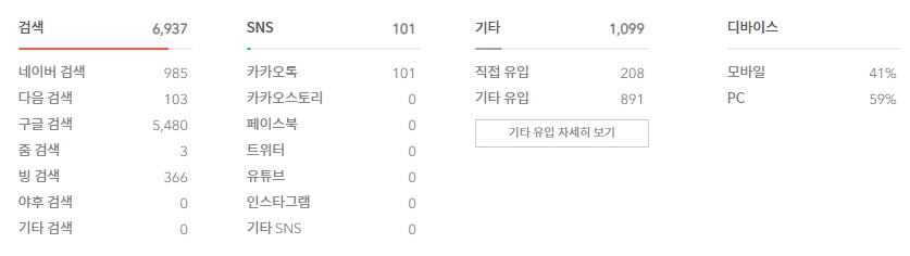우선 데이터센터에서 화재가 발생하기 전, 카카오 먹통 사태가 발생하기 전의 일일 방문자 수 입니다. 보면 알 수 있다시피 네이버 검색을 통한 방문자 수는 985명, 그리고 기타 유입에서도 네이버를 통해 들어온 사람들이 289명이 있었습니다. 대략 네이버를 통해 블로그에 방문하는 사람들이 1,000명 정도였습니다.