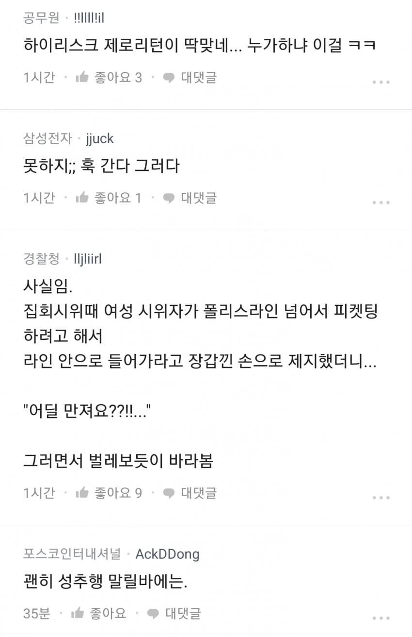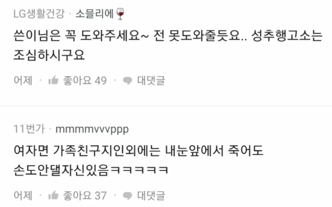 남녀갈등문제가 해결될 기미는 커녕 계속 심화되고 있고, 그로 인해 이러한 상황까지 온게 아닌가 싶습니다. 다들 서로를 물어뜯기보다는 화합하면 좋겠네요. 그러면 이번 포스팅은 여기서 마무리하도록 하고 다음번에는 또 다른 글로 다시 찾아오도록 하겠습니다. :)