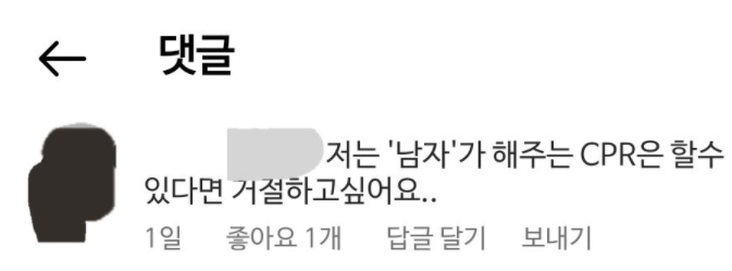 이러한 이유들로 인해 남성들은 만약 CPR로 여성 환자를 살려냈어도 '브래지어를 벗기고 가슴을 만졌다, 성추행 아니냐?', '누가 늑골을 부러뜨리라 했냐, 상해죄로 고소하겠다' 등의 말이 나올까 두려워하는 것이죠. 물론 선한 사마리아인 법이 있기는 합니다만, 만약 사람을 살려놓고도 감사인사를 받기는 커녕 오히려 고소를 당하고 무죄가 나올 때 까지 법원에 들락거려야 한다는 것은 어마어마한 스트레스로 작용합니다. 물론 그런 몰상식한 사람들이 많이 있을거라 생각은 하지 않지만, 그런 일이 발생하지 않을 것이라는 보장도 없기 때문에 주저하는 것이죠.