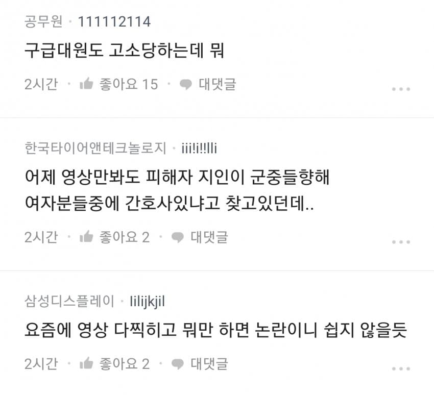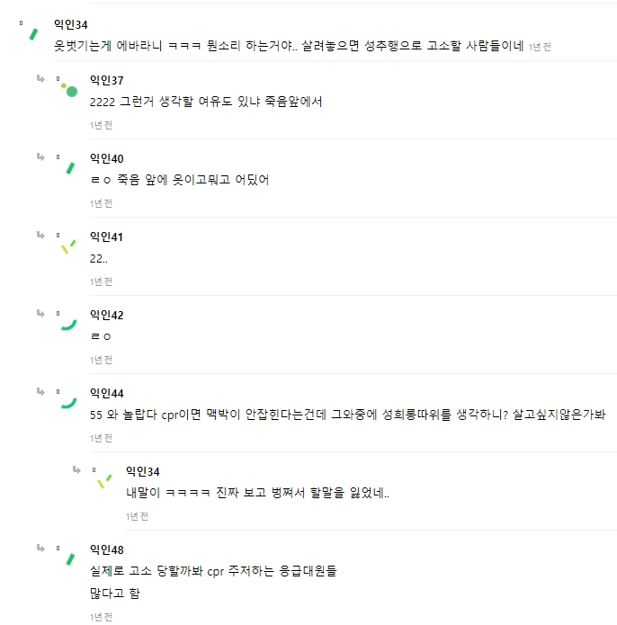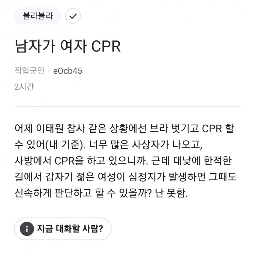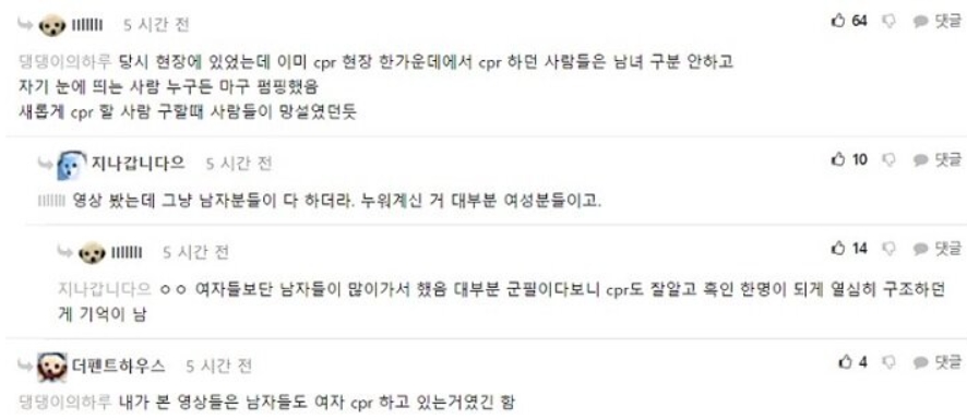 앞부분 뉴스에서는 남성들이 여성들에게 CPR을 하는 것을 주저했다고 나오는데, 해당 뉴스는 어디까지 인터넷 커뮤니티의 내용을 그대로 언급한 것입니다. 실제로는 많은 사람들이 성별에 관계없이 목숨을 구하기 위해 CPR을 시행했을거라 생각하고(참고), 여성이라 주저한 것 보다 처음 눈 앞에 펼처친 지옥과도 같은 광경으로 인해 주저한 것이 아닌가 싶습니다. 참사 현장을 영상이나 사진으로만 봐도 무서운데 현장에 있는 사람들이라면 더더욱 그러했을거라 생각합니다. 이를 남녀 갈라치기로 이용하지 않기를 바랍니다.