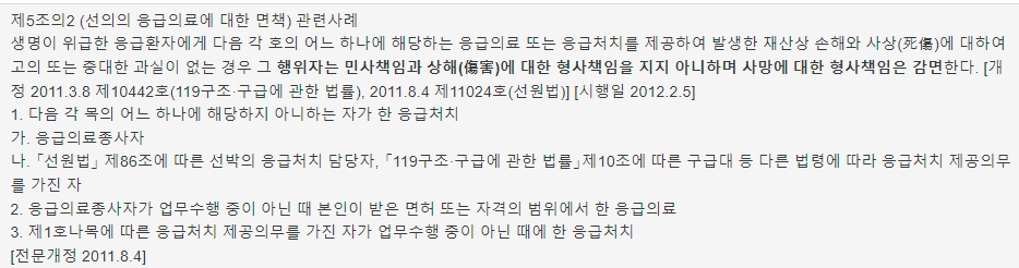 짧게 요약하면 '일반인이 생명이 위험한 응급환자에게 응급의료 처치 과정으로 도움을 주었을 때, 응급의료 처치로 인한 손해, 상해에 대해 민사책임, 형사처벌을 받지 아니하고 사망에 대해 처벌 수준이 감경된다는 법입니다. 이게 국내의 선한 사마리아인 법이죠.