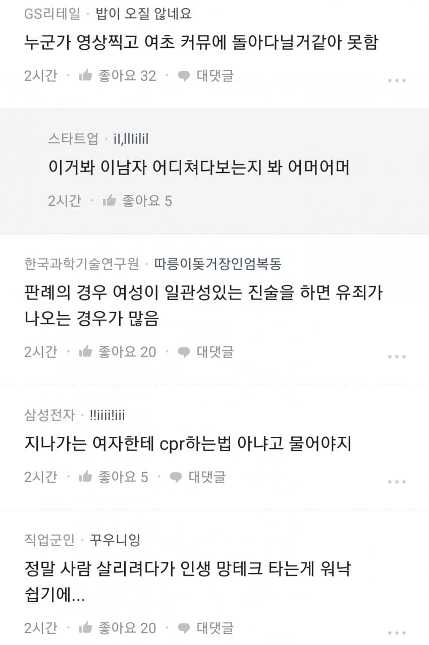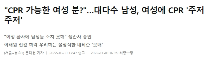 앞부분 뉴스에서는 남성들이 여성들에게 CPR을 하는 것을 주저했다고 나오는데, 해당 뉴스는 어디까지 인터넷 커뮤니티의 내용을 그대로 언급한 것입니다. 실제로는 많은 사람들이 성별에 관계없이 목숨을 구하기 위해 CPR을 시행했을거라 생각하고(참고), 여성이라 주저한 것 보다 처음 눈 앞에 펼처친 지옥과도 같은 광경으로 인해 주저한 것이 아닌가 싶습니다. 참사 현장을 영상이나 사진으로만 봐도 무서운데 현장에 있는 사람들이라면 더더욱 그러했을거라 생각합니다. 이를 남녀 갈라치기로 이용하지 않기를 바랍니다.