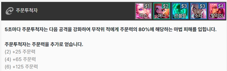 주문투척자는 5초마다 다음 공격을 강화하여 무작위 적에게 80%에 해당하는 마법 피해를 입힙니다. 또한 주문투척자는 주문력을 추가로 얻습니다. 럭스, 애니, 르블랑, 소나, 탈리야로 이루어져 있습니다.