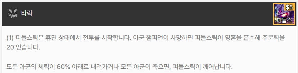 피들스틱은 휴면 상태에서 전투를 시작하며, 아군 챔피언 사망시 피들스틱이 영혼을 흡수하여 주문력을 20 얻습니다. 모든 아군의 체력이 60% 아래로 내려가거나 모든 아군이 죽으면, 피들스틱이 깨어납니다. 타락은 피들스틱 한 명으로 이루어져 있습니다.