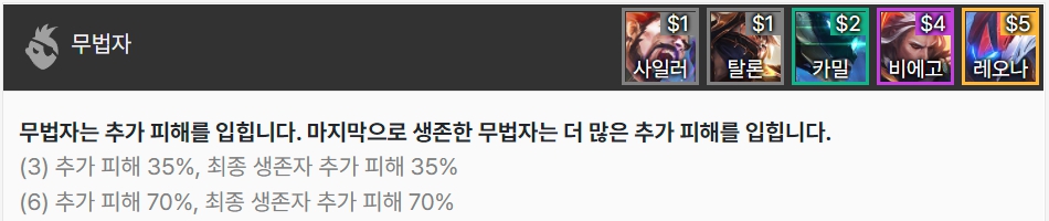 무법자는 추가 피해를 입히며, 마지막으로 생존한 무법자는 더 큰 추가 피해를 입힙니다. 사일러스, 탈론, 카밀, 비에고, 레오나로 이루어져 있습니다.