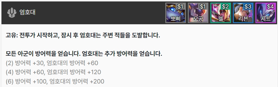 엄호대는 전투가 시작되면 잠시 후 주변 적들을 도발합니다. 모든 아군이 방어력을 얻으며 엄호대는 추가 방어력을 얻습니다. 뽀삐, 오공, 렐, 리븐, 세트로 이루어져 있습니다.