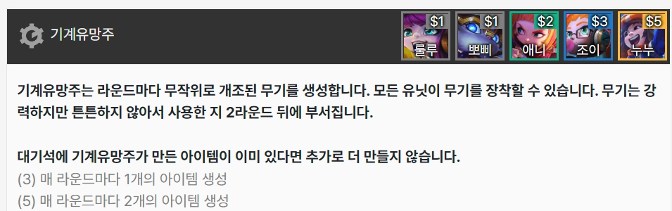 기계 유망주는 매 라운드마다 무작위 개조된 무기(완성형 아이템)를 생성하며, 해당 무기는 튼튼하지 않아 2라운드 뒤에 부서집니다. (3)에서는 1개, (5)에서는 2개씩 아이템을 생성합니다. 룰루, 뽀삐, 애니, 조이, 누누로 이루어져 있습니다.