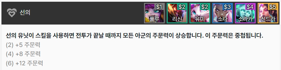 선의 유닛은 스킬을 사용할 때 마다 전투가 끝날 때 까지 아군의 주문력이 상승합니다. 룰루, 리신, 유미, 소나, 소라카, 신드라로 이루어져 있습니다.