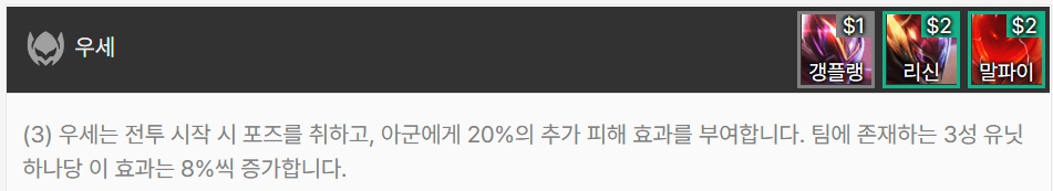 우세는 전투 시작 시 포즈를 취하고 아군에게 20% 추가 피해 효과를 부여합니다. 팀에 존재하는 3성 유닛 하나당 이 효과가 8%씩 증가합니다. 갱플랭크, 리신, 말파이트로 이루어져 있습니다.