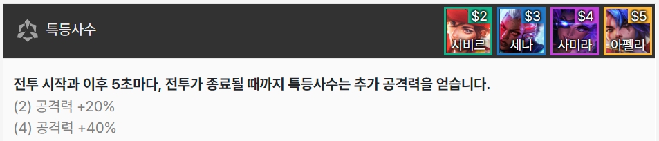 특등사수는 전투 시작시, 그리고 이후 5초마다 전투가 종료될 때까지 추가 공격력을 얻습니다. 시비르, 세나, 사미라, 아펠리오스로 이루어져 있습니다.