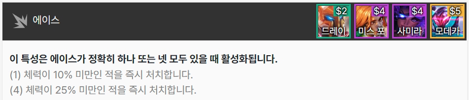 에이스는 에이스 유닛이 정확히 하나 또는 넷 모두 있을 때 활성화됩니다. (1)일때는 체력이 10% 미만인 적을 즉시 처치, (4)일때는 체력이 25% 미만인 적을 즉시 처치합니다. 드레이븐, 미스 포츈, 사미라, 모데카이저로 이루어져 있습니다.