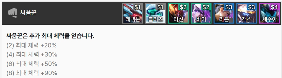 싸움꾼은 추가 최대 체력을 얻습니다. 레넥톤, 블리츠크랭크, 리신, 바이, 리븐, 잭스, 세주아니로 이루어져 있습니다.
