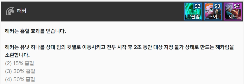 해커는 흡혈 효과를 얻습니다. 유닛 하나를 상대 팀의 뒷열로 이동시키고, 전투 시작 2초 동안 대상 지정 불가 상태로 만드는 헤카림을 소환합니다. 르블랑, 조이, 제드로 이루어져 있습니다.