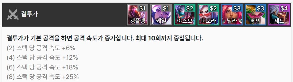 결투가는 기본 공격을 할 때 마다 공격 속도가 증가하며 최대 10회까지 중첩됩니다. 갱플랭크, 케일, 야스오, 피오라, 닐라, 베인, 제드로 이루어져 있습니다.