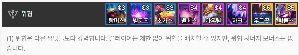 위협은 다른 일반 유닛들보다 강력합니다. 하지만 다른 시너지, 특성 효과는 존재하지 않습니다.