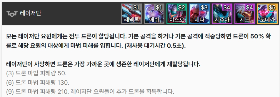 모든 레이저단은 전투 드론이 할당되어 기본 공격을 하거나 기본 공격에 적중당하면 해당 요원의 대상에게 드론이 50% 확률로 마법 피해를 입힙니다. 레이저단 사망 시 드론은 가까운 생존한 레이저단에게 재할당됩니다. 레넥톤, 애쉬, 야스오, 세나, 세주아니, 제드, 모데카이저로 이루어져 있습니다.