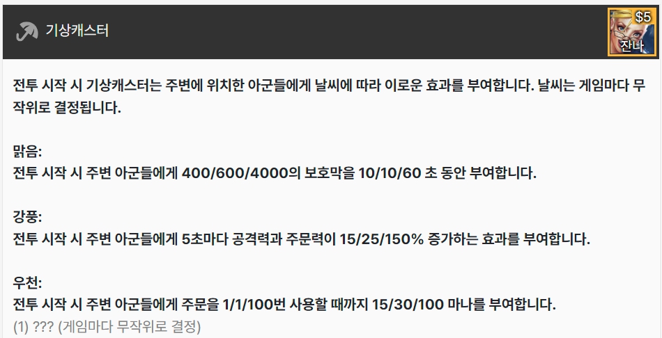 전투 시작 시 기상캐스터는 주변의 아군들에게 날씨에 따른 효과를 부여합니다. 날씨는 게임마다 무작위로 결정되고 '맑음'에서는 보호막, '강풍'에서는 5초마다 공격력과 주문력 증가, '우천'에서는 전투 시작 시 아군들이 스킬을 1/1/100번 사용할 때 까지 15/30/100 마나를 부여합니다. 잔나 한 명으로 이루어져 있습니다.