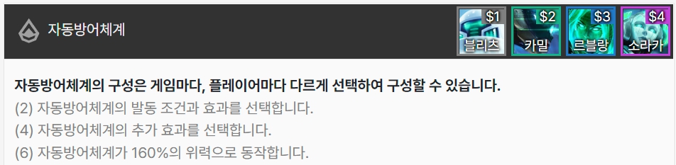 자동방어체계의 특성/시너지 효과는 플레이어가 직접 선택하여 구성할 수 있습니다. 블리츠크랭크, 카밀, 르블랑, 소라카로 이루어져 있습니다.