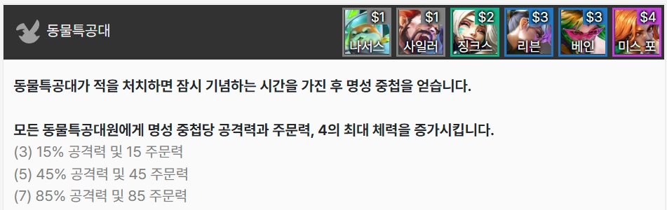 동물특공대는 적을 처치하면 잠시 멈춘 뒤 명성 중첩을 얻습니다. 동물특공대 챔피언은 명성 중첩당 공격력, 주문력을 얻으며 4의 최대 체력을 증가시킵니다. 나서스, 사일러스, 징크스, 리븐, 베인, 미스 포츈으로 이루어져 있습니다.