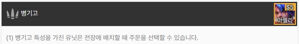 병기고 특성을 지닌 유닛은 전장에 배치할 때 주문(스킬)을 선택할 수 있습니다. 아펠리오스 한 명으로 이루어져 있습니다.