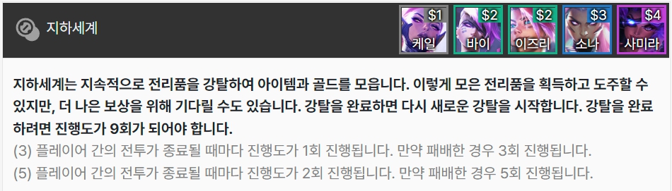 지하세계는 플레이어간의 전투가 종료될 때 마다 강탈 진행도가 쌓이며, 진행도가 9회 쌓이면 전리품 아이템, 골드를 획득하거나 그냥 넘길 수 있습니다. 그냥 넘기는 경우 다음 번 강탈에서 더 좋은 보상을 얻으며, (3)에서 전투 종료시 1회, 패배한 경우 3회 쌓이고, (5)에서 전투 종료시 2회, 패배 한 경우 5회 쌓입니다. 케일, 바이, 이즈리얼, 소나, 사미라로 이루어져 있습니다.