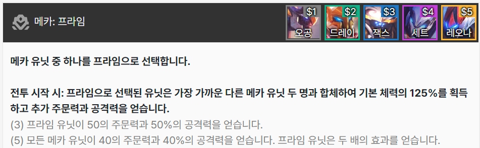 메카 유닛 중 하나를 프라임으로 선택합니다. 선택된 챔피언은 가장 가까운 다른 메카 유닛 두 명과 합체하여 기본 체력의 125%를 획득하고 추가 주문력과 공격력을 얻습니다. 오공, 드레이븐, 잭스, 세트, 레오나로 이루어져 있습니다.