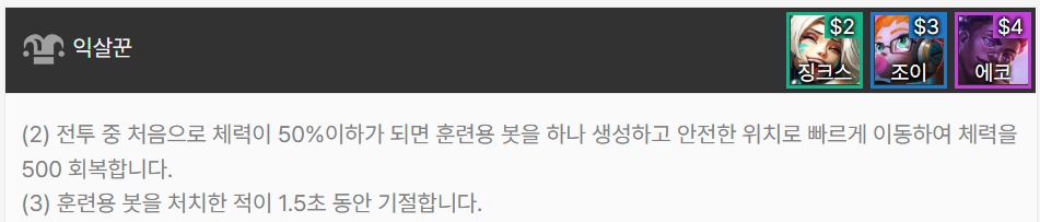 익살꾼은 전투 중 처음으로 체력이 50%이하가 되면 훈련용 봇을 하나 생성하고 안전한 위치로 이동하여 체력을 500 회복합니다. (3)에서는 훈련용 봇을 처치한 적이 1.5초 동안 기절합니다. 징크스, 조이, 에코로 이루어져 있습니다.