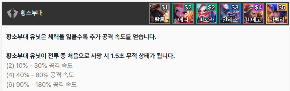 황소부대는 체력을 잃을수록 추가 공격 속도를 얻으며, 처음으로 사망 시 1.5초 무적 상태가 됩니다. 탈론, 애니, 피오라, 알리스타, 비에고, 아펠리오스로 이루어져 있습니다.