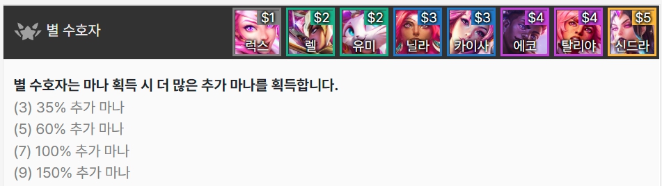 별 수호자는 마나 획득 시 더 많은 추가 마나를 획득합니다. 럭스, 렐, 유미, 닐라, 카이사, 에코, 탈리야, 신드라로 이루어져 있습니다.