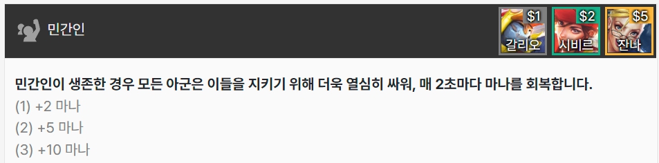 민간인은 생존한 경우 모든 아군은 매 2초마다 마나를 획득합니다. 갈리오, 시비르, 잔나로 이루어져 있습니다.