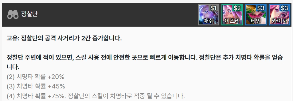 정찰단은 공격 사거리가 2칸 증가합니다. 정찰단 주변에 적이 있으면 스킬 사용 전 안전한 곳으로 빠르게 이동, 정찰단은 추가 치명타 확률을 얻습니다. 애쉬, 이즈리얼, 베인, 카이사로 이루어져 있습니다.