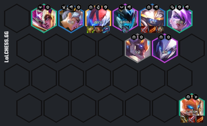 덱은 기본적으로 오공, 드레이븐, 렐, 바이, 리븐, 잭스, 세주아니, 세트, 레오나로 이루어져 있습니다. 9개의 챔피언이 필요한 관계로 9레벨을 달성해야 끝까지 덱을 완성시킬 수 있으며, 8렙에서는 레오나가 있는 경우 세주아니를 빼고 사용하는게 보통입니다.