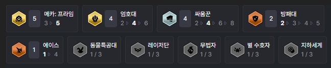 덱을 완성시켰을 때 챙길 수 있는 시너지는 메카: 프라임(5), 엄호대(4), 싸움꾼(4), 방패대(2), 에이스(1)입니다. 여기에서 증강이나 뒤집개를 통해 특성을 한 단계 업그레이드 시키는 것도 좋습니다.