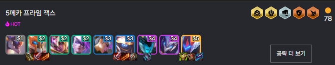 초반 바이와 레넥톤 또는 블리츠크랭크를 이용한 싸움꾼(2), 또는 오공과 뽀삐를 이용한 엄호대(2)로 시작하는게 안정성 있습니다. 잭스에게 만들어 줄 아이템을 모아가며 레벨업을 치면서 7레벨에 달성하고 잭스를 넣고 메카 프라임(3)을 달성하여 잭스를 강화시켜줍니다. 이후 50원 이자를 모으며 레벨업을 노려 덱을 완성시켜주면 되겠습니다.