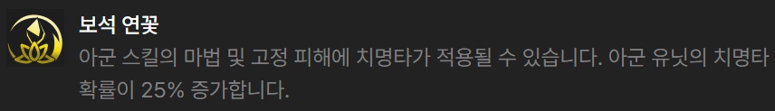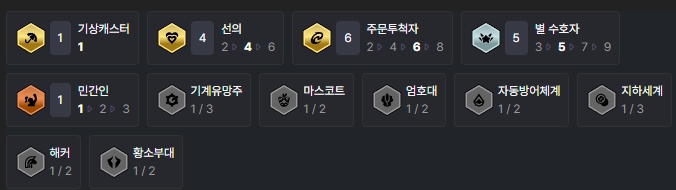 그 외 증강체중 잘 어울리는 것은 뒤집개나 특성 관련 증강체입니다. 9레벨에 도달하지 않아도 덱을 어느정도 갖출 수 있게 도와주며, 이 이외에는 보석 연꽃, 원형의 원칙낫, 신병, 휴대용 대장간 등이 있고, 천상의 축복, 사냥의 증표, 루덴의 메아리 등 전투 관련 증강체도 평타는 칩니다.
