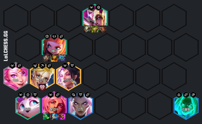 주문투척자 탈리야덱은 기본적으로 럭스, 렐, 애니, 유미, 르블랑, 소나, 탈리야, 신드라, 잔나로 이루어져 있습니다. 9개의 유닛을 필요로 하므로 9레벨에 도달해야되어 덱을 끝까지 완성하기 쉽지는 않습니다.