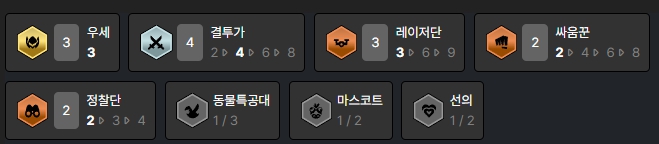 덱을 완성시키면 챙길 수 있는 시너지는 우세(3), 결투가(4), 레이저단(3), 싸움꾼(2), 정찰단(2)입니다.