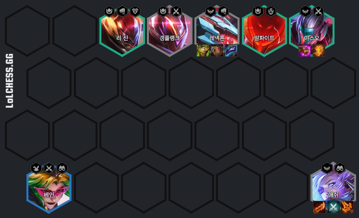 애쉬, 레넥톤, 갱플랭크, 야스오, 리신, 말파이트 이 여섯 챔피언을 계속 구매해주면서 레벨업을 치지 않고 50원 이자를 돌리며 3성작을 해주면 됩니다. 4레벨에는 애쉬, 레넥톤, 야스오, 갱플랭크로 구성해주고 5레벨에는 리신이나 말파이트 중 한 명을 넣어주면 됩니다. 6레벨이 되면 우세(3)을 맞추고 3성작이 어느정도 끝났다면 7레벨에 도달하여 베인을 찾아 넣어주면 되겠습니다.