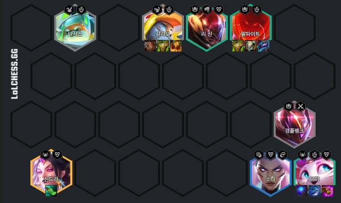 갈리오, 갱플랭크, 나서스, 리신, 말파이트, 유미, 소나, 신드라로 이루어져 있습니다.