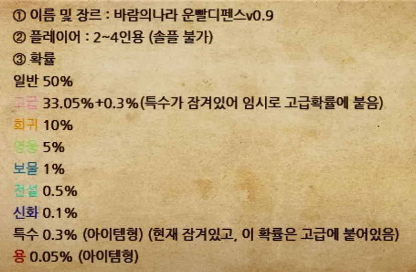 메이플 운빨 디펜스와 마찬가지로 솔플이 불가능하며 확률에 따라 뽑히는 유닛의 등급이 다릅니다. 현재로서는 일반(50%), 고급(33.05%+0.3%), 희귀(10%), 영웅(5%), 보물(1%), 전설(0.5%), 신화(0.1%), 특수(0.3%), 용(0.05%) 종류가 있습니다.