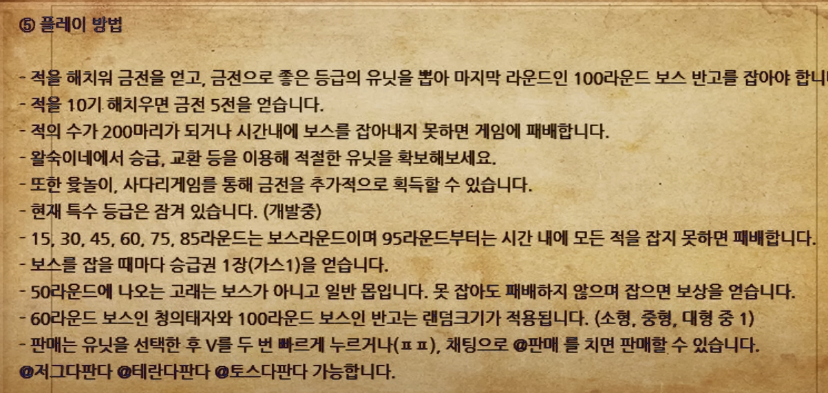 플레이 방법은 메운디와 거의 비슷하며, 다만 유닛 판매가 더 쉬워졌고, 게임 안의 미니게임인 윷놀이와 사다리게임이 있어서 더욱 가챠 느낌이 커졌습니다.