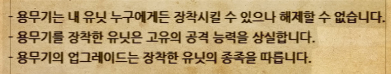0.05%로 등장하는 용무기는 본인 유닛 누구에게나 장착시킬 수 있으며, 다만 해제는 하지 못합니다. 또한 업그레이드는 장착한 유닛의 종족을 따릅니다. 예를 들어 메운디에서는 드라군 빌드업으로 프로토스 업글만 하고 있었는데 태초 히드라가 뜨거나 하면 거의 망한판이지만, 바운디에서는 장착식이기 때문에 그러한 일이 없습니다.