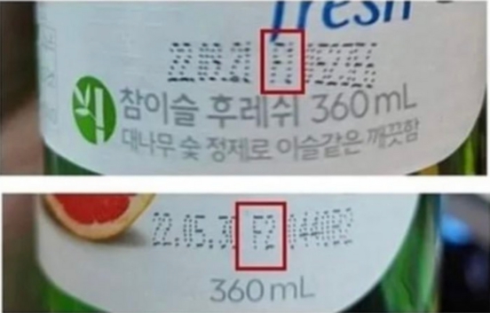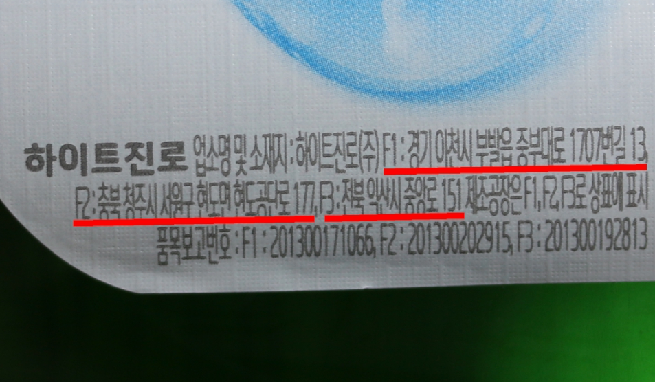 따라서 제조일자 오른 쪽에 공장 위치 코드가 F1이 적혀있다면 경기 이천 공장에서 만들어진 것이고, F2면 충북 청주 공장, F3이면 전북 익산 공장에서 제조된 참이슬입니다.